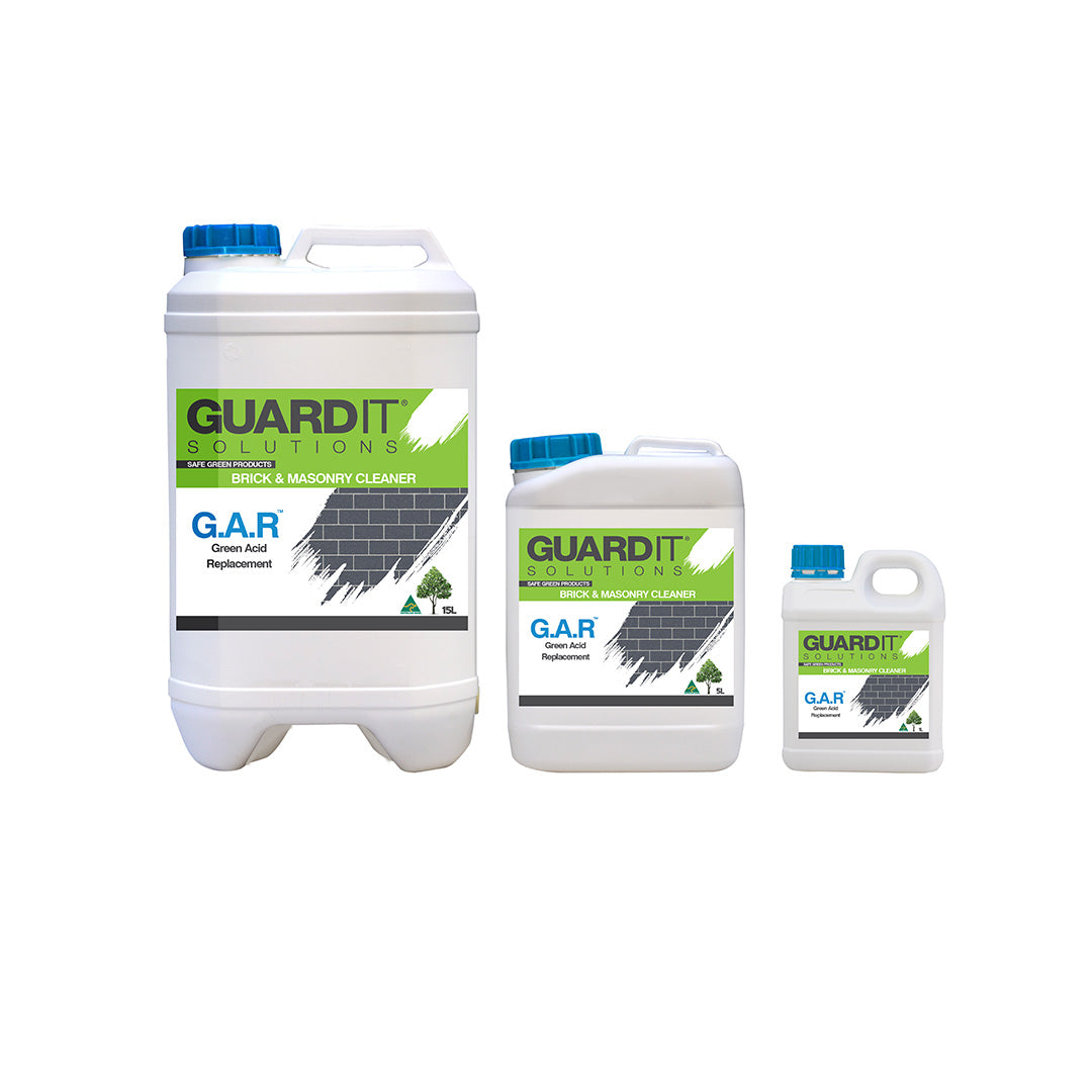 GuardIT® Green Acid Replacement (G.A.R), is an environmentally responsible acid alternative. Green Acid is a safe alternative to harsh acids, replacing hydrochloric acid in the removal of cement residue, mortar residue and efflorescense. Suitable for removing cement residue from concrete, sandstone, ceramic, terracotta, bricks, blue stone, painted metal surfaces and other similar surfaces. Not suitable on Zincalume.